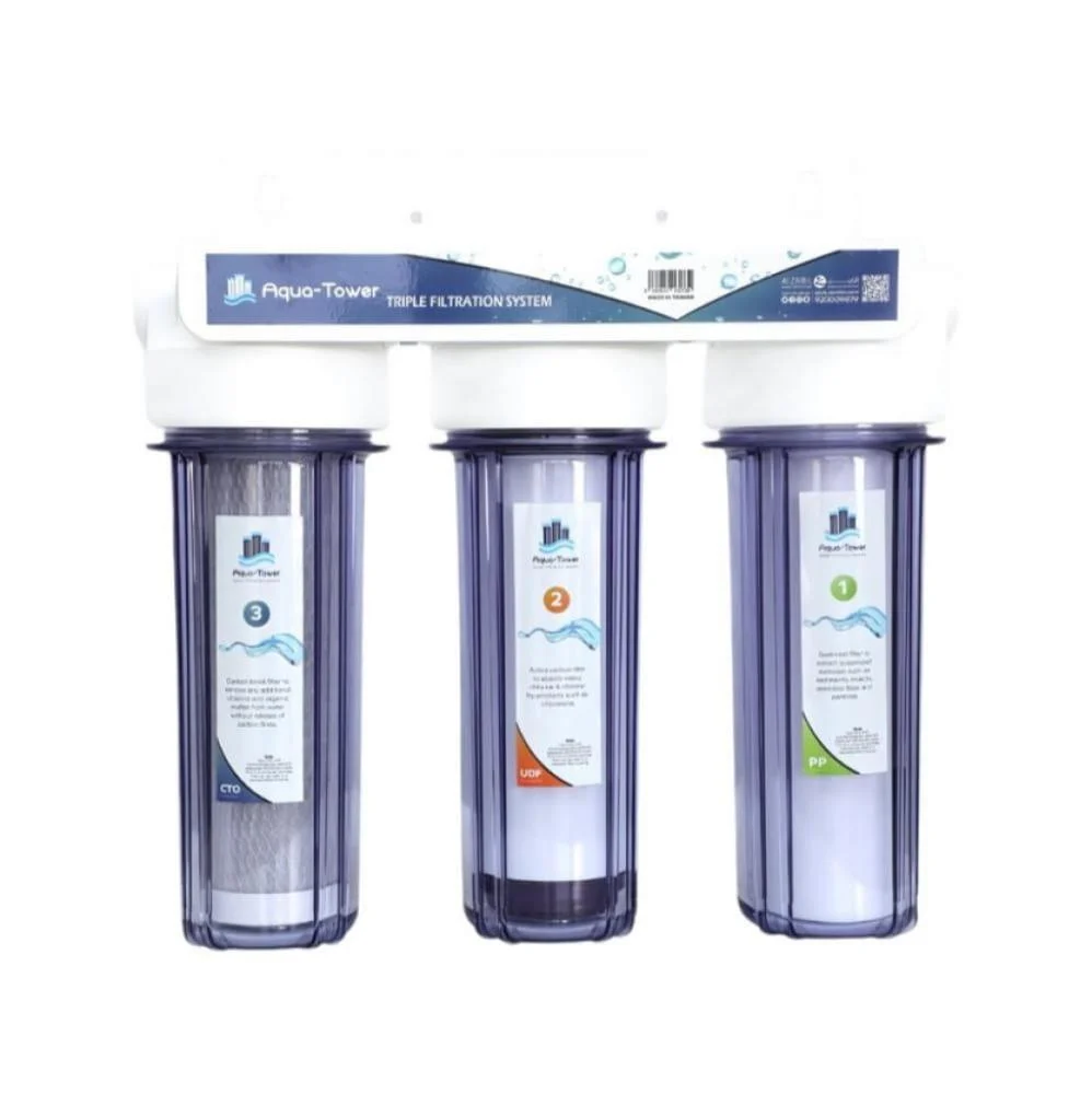 فلتر ماء ثلاثي 3 مراحل مصمم لإزالة الملوثات من الماء ، مما يجعله نظيفًا وآمنًا للشرب.
