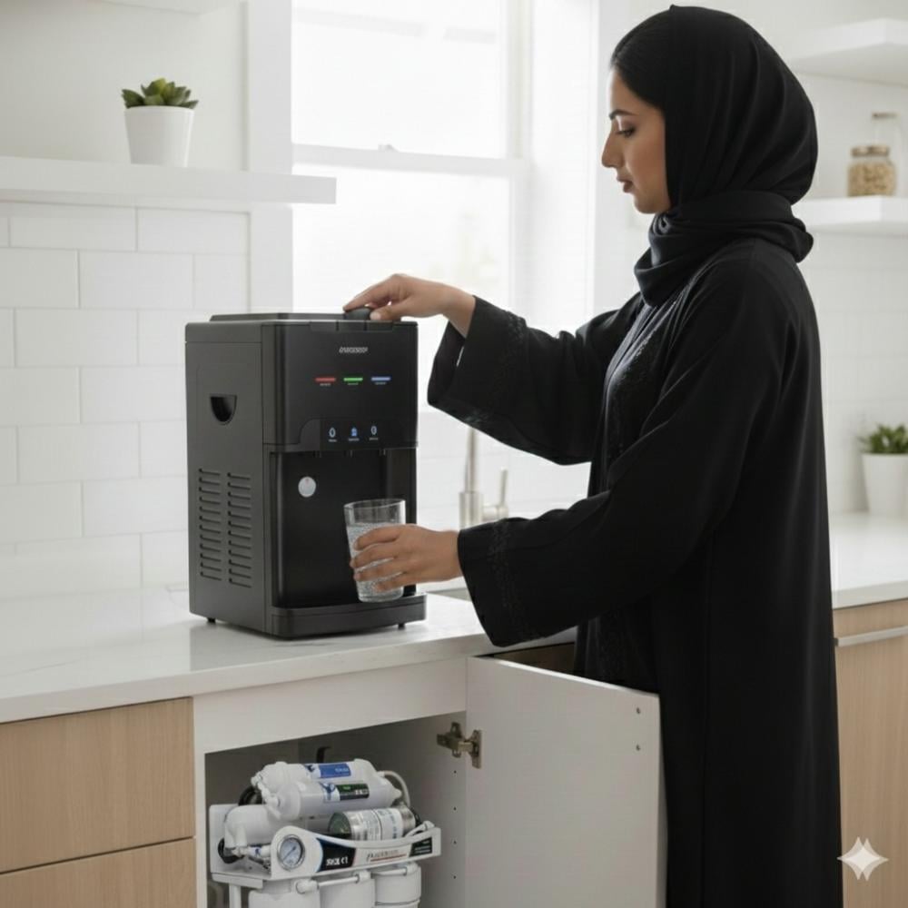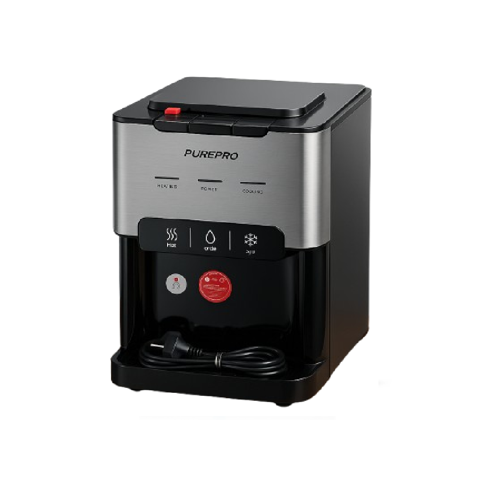 برادة مياه ذاتية التعبئة PUREPRO باللون الأسود هي الحل المثالي للمنازل والمكاتب والمساجد، تعمل بدون الحاجة لقوارير المياه حيث يتم توصيلها مباشرة بفلتر التحلية لتوفير مياه نقية وباردة باستمرار.
